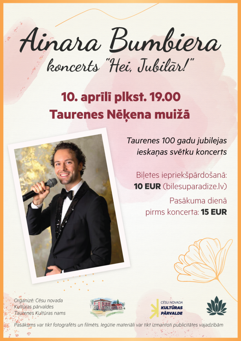 Kur skan smiekli, tur skan dziesma! Latvijā ir neoficiāls likums – ja mājās, pilsētā vai novadā svin kārtīgus svētkus, tad tur noteikti ir lieliskais Ainars Bumbieris. Viņa balss un enerģija ir kļuvusi par sinonīmu dzīvespriekam, un nav iedomājama neviena jubileja bez hita "Hej, jubilār!", kas šobrīd ir populārākā apsveikuma dziesma republikā. 10. aprīlī plkst. 19.00 šī svētku enerģija piestās Taurenē, lai kopīgi ieskandinātu, ko patiešām īpašu.