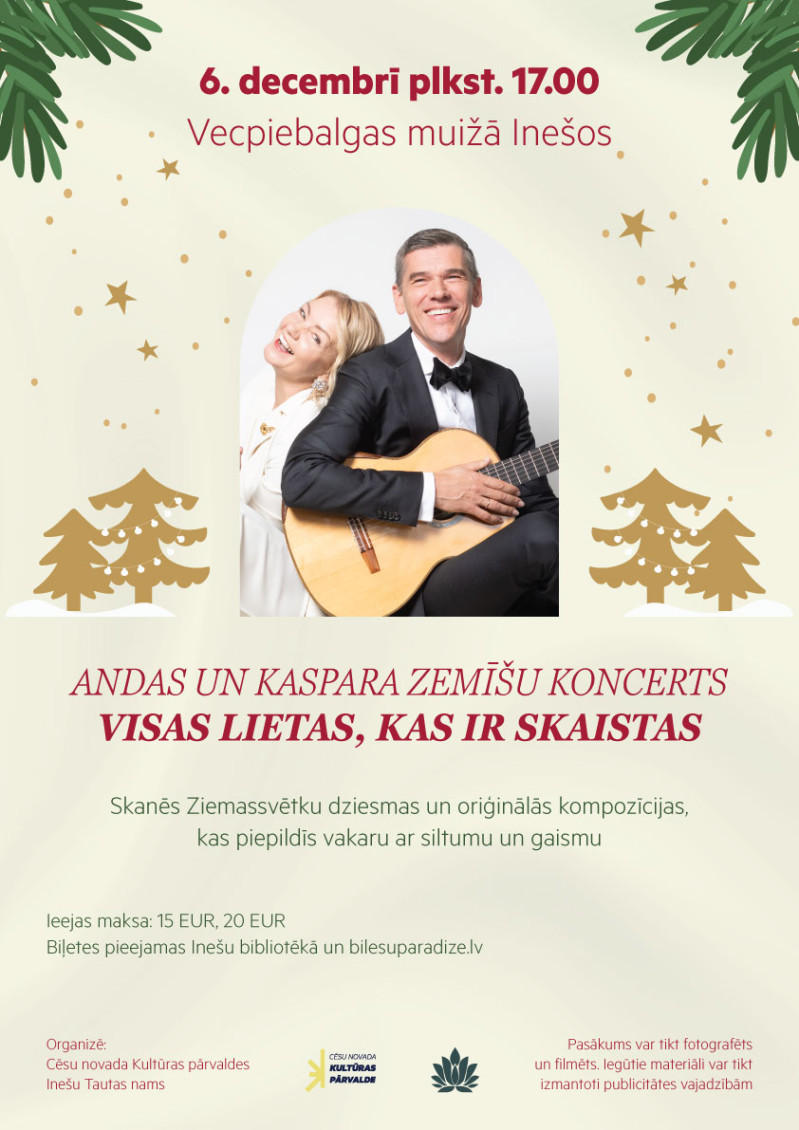 Sestdien, 6. decembrī, plkst. 17.00 Vecpiebalgas muižā Inešos izskanēs Andas un Kaspara Zemīšu koncerts "Visas lietas, kas ir skaistas".