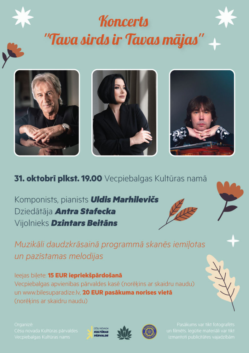 Piektdien, 31. oktobrī, plkst. 19.00 Vecpiebalgas Kultūras namā izskanēs koncerts "Tava sirds ir Tavas mājas".