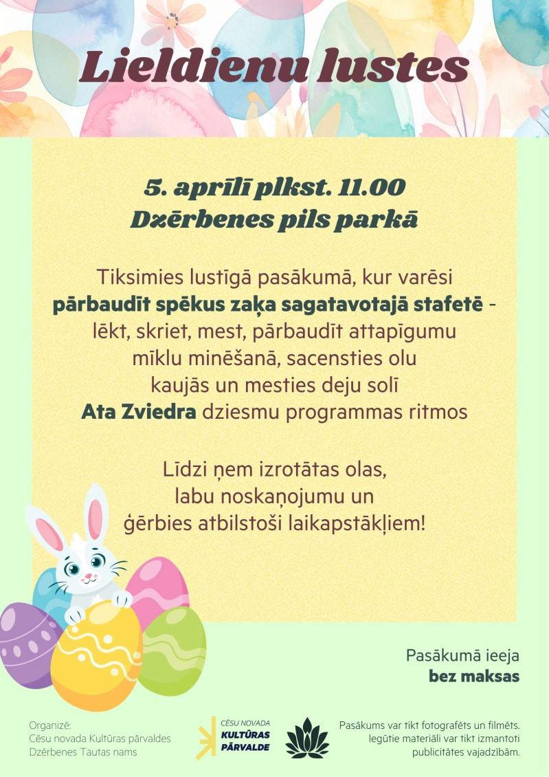Lieldienās, 5. aprīlī, plkst. 11.00 Dzērbenes Tautas nams aicina uz Lieldienu lustēm Dzērbenes pils parkā.