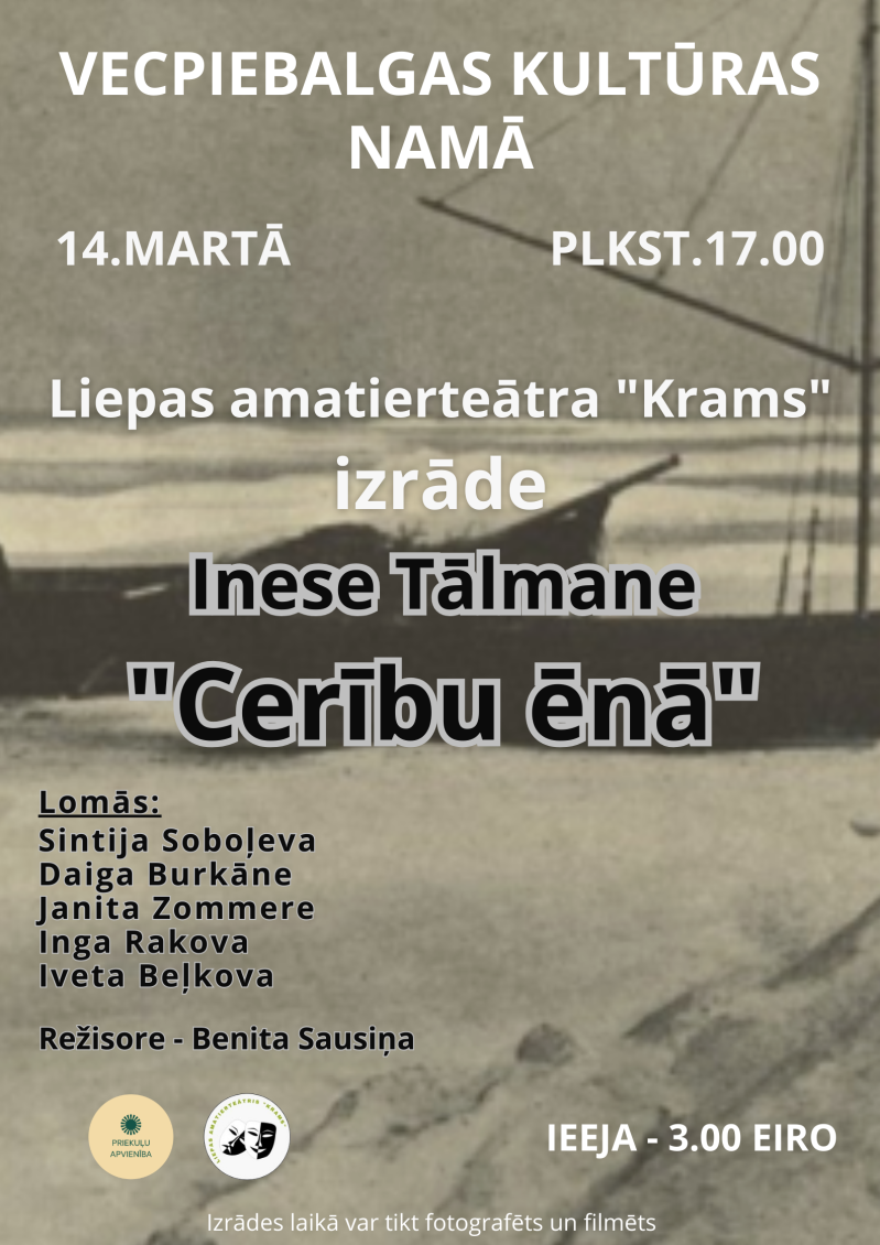 Sestdien, 14. martā, plkst. 17.00 Vecpiebalgas Kultūras namā būs skatāma Liepas amatierteātra “Krams” izpildījumā Ineses Tālmanes luga “Cerību ēnā” (par tām, kas gaidīja krastā, pēc R. Blaumaņa noveles “Nāves ēnā”).