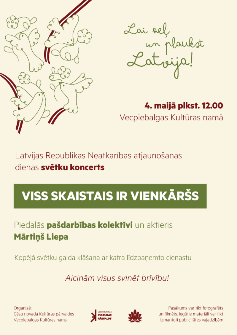 Pirmdien, 4. maijā, plkst. 12.00 Vecpiebalgas Kultūras namā izskanēs Latvijas Republikas Neatkarības atjaunošanas dienas svētku koncerts "Viss skaistais ir vienkāršs".