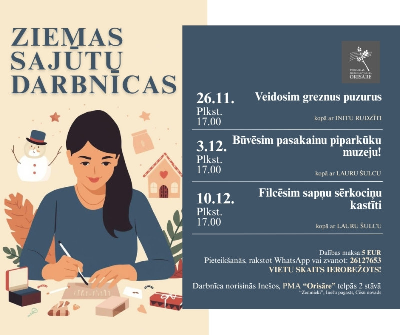 Tiekamies siltās ziemas sajūtās PMA “Orisāres” telpās 2. stāvā. (tautā sauktā Inešu pamatskola).