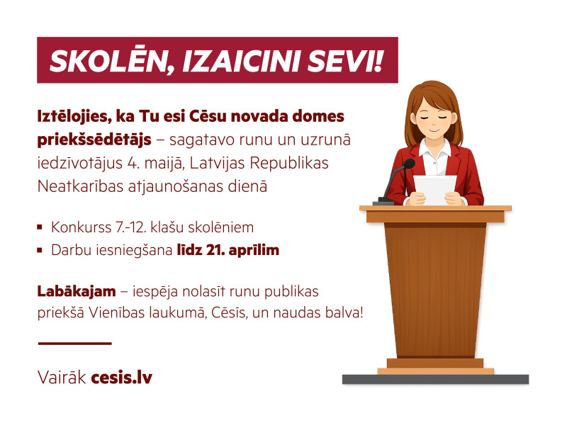 Labākajam dalībniekam būs iespēja nolasīt savu runu 4. maija svētkos Vienības laukumā Cēsīs un saņemt naudas balvu 100 eiro apmērā.