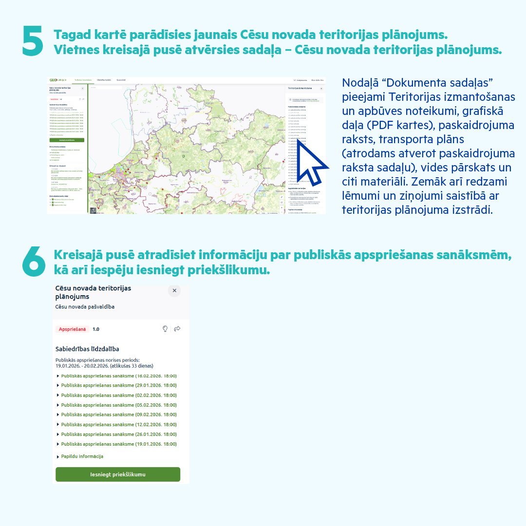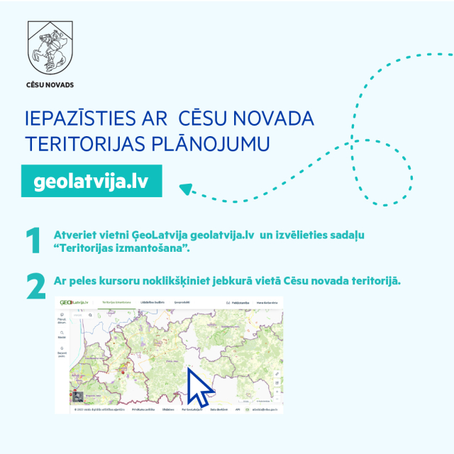 Ar visiem teritorijas plānojuma materiāliem iespējams iepazīties GeoLatvija portālā geolatvija.lv (skaties pamācību, kā atrast un apskatīt plānojumu).