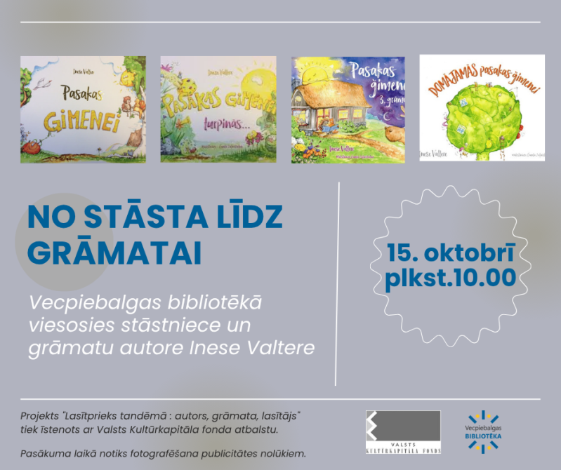Trešdien, 15. oktobrī, plkst. 10.00 ar Vecpiebalgas pagasta bibliotēkas mazajiem lasītājiem tiksies grāmatu autore Inese Valtere izzinošā nodarbībā “No stāsta līdz grāmatai”.