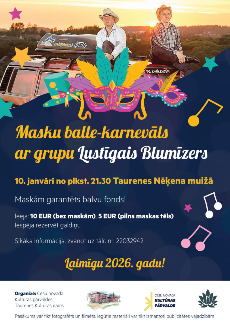 Sestdien, 10. janvārī, plkst. 21.30 Taurenes Nēķena muižā norisināsies masku balle - karnevāls ar grupu "Lustīgais Blumīzers".