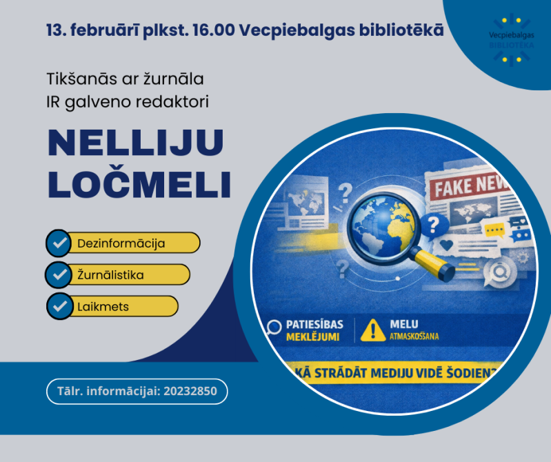 Piektdien, 13. februārī, plkst. 16.00 Vecpiebalgas bibliotēka aicina uz tikšanos ar žurnāla IR galveno redaktori Nelliju Ločmeli, lai uzzinātu: