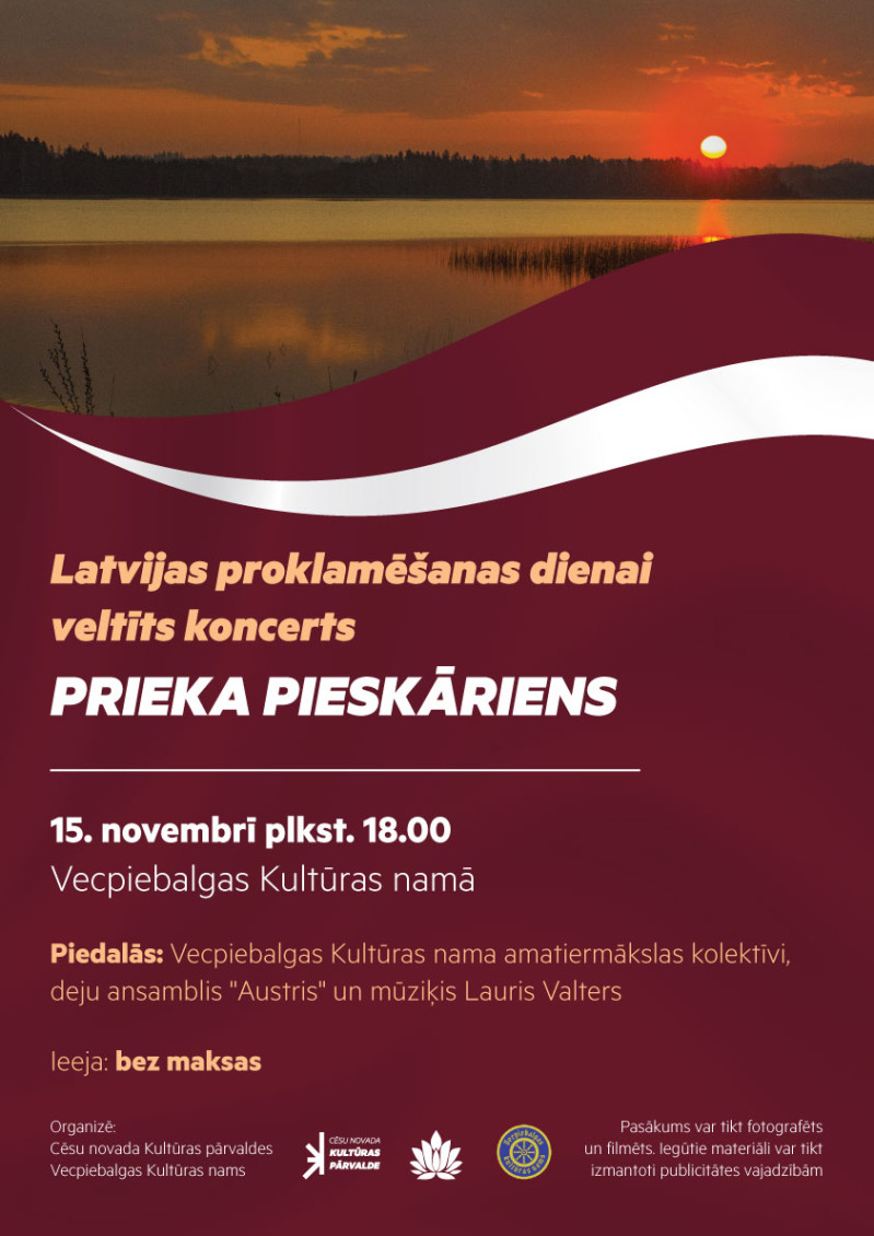 Sestdien, 15. novembrī, plkst. 18.00 Vecpiebalgas Kultūras namā izskanēs Latvijas proklamēšanas dienai veltīts koncerts "Prieka pieskāriens".