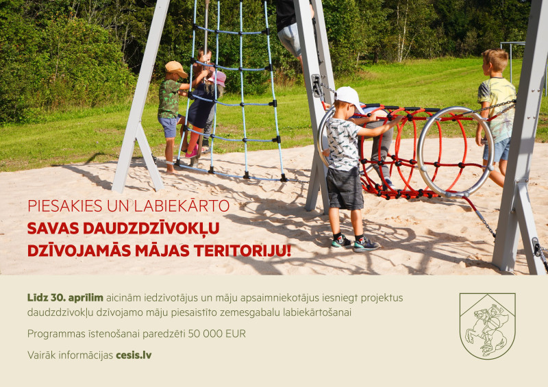 Cēsu novada pašvaldība aicina daudzdzīvokļu dzīvojamo māju dzīvokļu īpašniekus, biedrības un apsaimniekotājus līdz 2026. gada 30. aprīlim iesniegt projektu pieteikumus līdzfinansējuma saņemšanai mājām piesaistīto zemesgabalu labiekārtošanai.